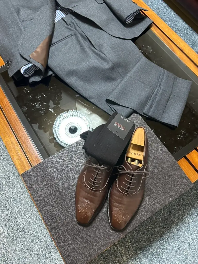 写真のように、靴下もダークブラウンで統一することで、足長効果とともに全体の調和が生まれます。