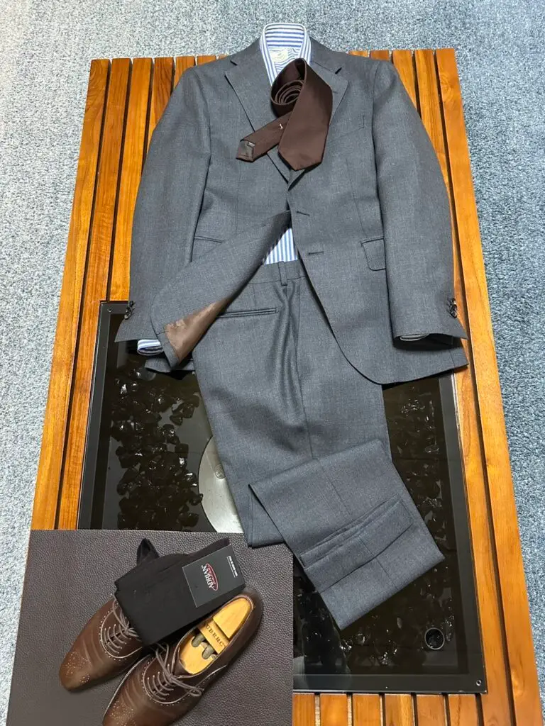 • 足元: ネクタイの色を拾い、靴もダークブラウンのブローグシューズをセレクト。黒靴ではなく茶靴を合わせることで、グレースーツの堅苦しさを和らげ、洗練された印象に仕上げています。